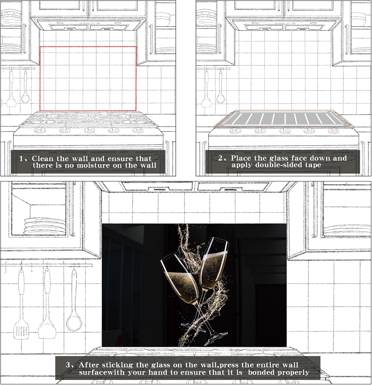 Our backsplashes are designed for easy DIY installation. They can be mounted with double-sided tape. Instructions and all necessary materials are included.